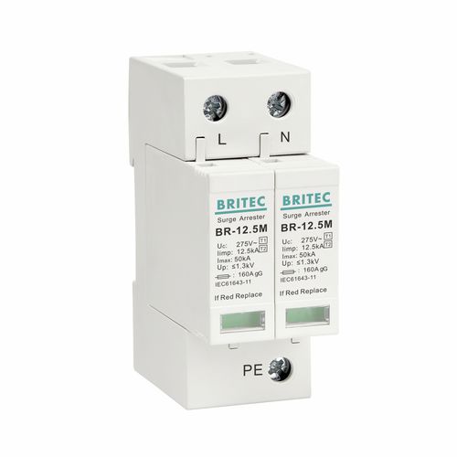 Особенности: Прочный, выдерживает тысячи ударов. Индикация статуса. Светодиодная индикация состояния. Uc 150В/275В/320В может быть достигнуто. Класс защиты: Тип 1+2, Класс I+II. Номер полюса: 1P,2P,3P,4P,1+1NPE,3+1NPE. Ограничитель перенапряжений БР-12,5М 2П подходит для однофазной системы TN.
