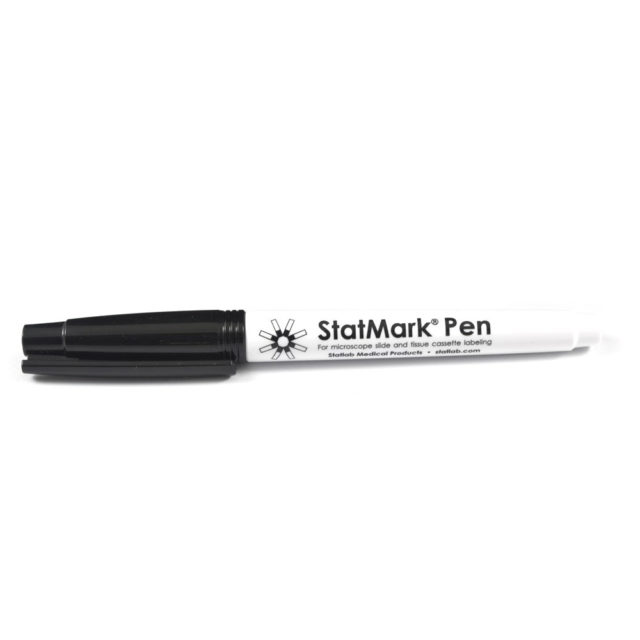 The STATMARK Pen is the ideal black marker for histology and cytology labs. The permanent ink resists even the harshest chemicals, including formalin, ethanol, isopropanol and xylene. The writing remains clean, clear and legible throughout the range of laboratory procedures, including processing and staining. The ink dries quickly and will not run or smear. It lasts through fixatives, baths, dips, stains, bleaches and more.