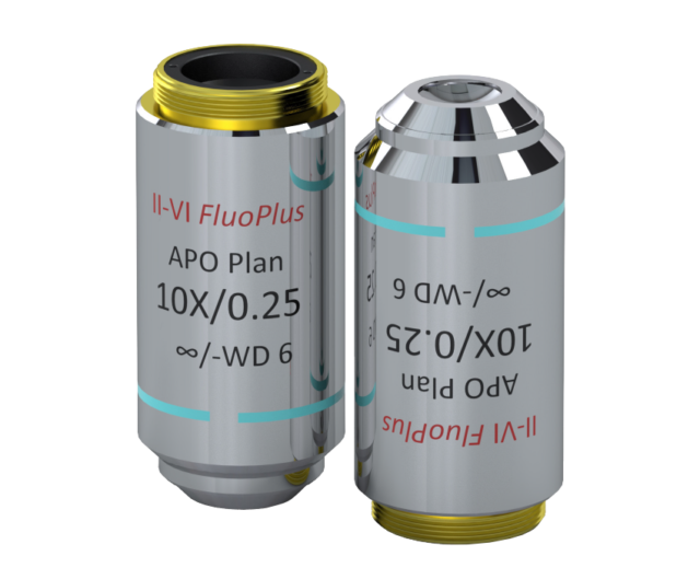 Цели APO Plan устраняют ошибки фокусировки хроматической дисперсии. Они имеют современную апохроматическую (с цветовой коррекцией) конструкцию с субволновой точностью поверхности на всех поверхностях линз, что обеспечивает высочайшие характеристики для стеклянных объективов.