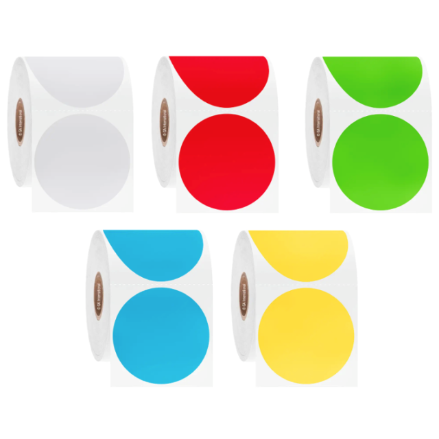 Circular labels (50.8mm diameter) in various colours available on perforated rolls with 25.4mm or 76.2mm core.