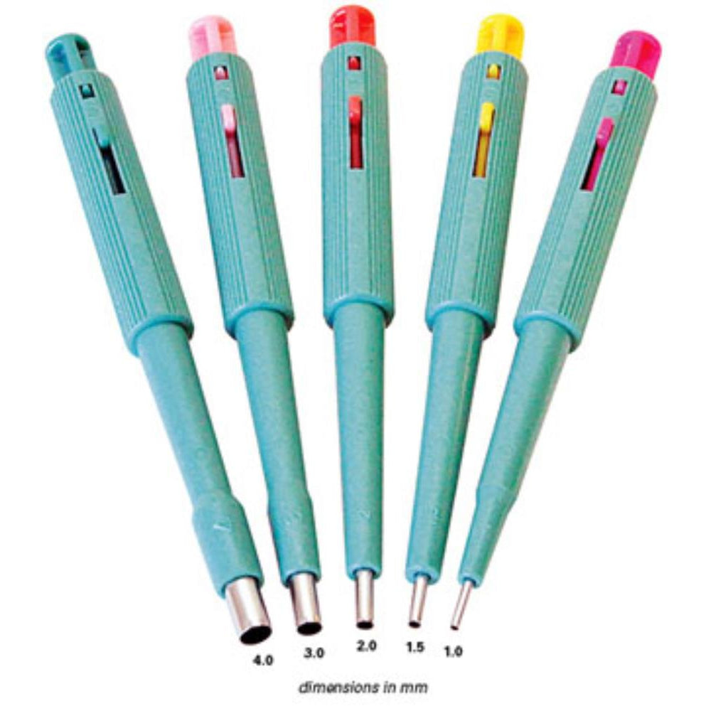 They are available in 5 core size diameters: 1.0, 1.5, 2.0, 3.0 and 4.0mm. All punches are colour coded by size.