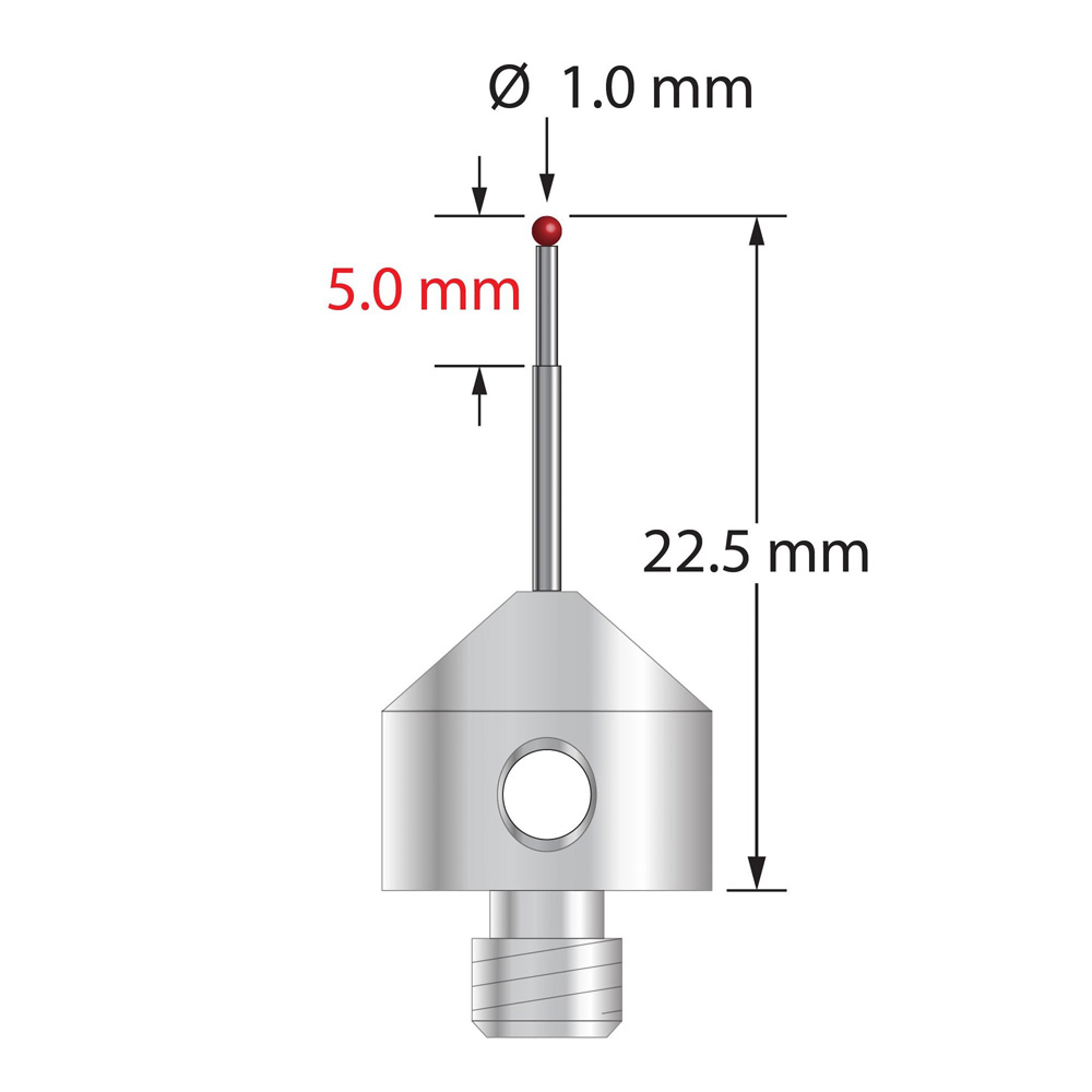 Описание Щуп M5 с рубиновым шариком диаметром 1,0 мм, ступенчатым твердосплавным стержнем и основанием из нержавеющей стали диаметром 11,0 мм и длиной 10,0 мм. Малый диаметр ножки 0,8 мм, большой диаметр 1,0 мм. Общая длина стилуса составляет 22,5 мм. Вес стилуса составляет 5,66 грамма. Сравните с Zeiss 626115-0100-022. Технические характеристики