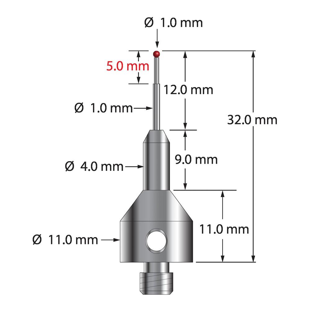 Описание Щуп M5 с рубиновым шариком диаметром 1,0 мм, ступенчатым карбидным стержнем и основанием из нержавеющей стали диаметром 11,0 мм и длиной 20,0 мм. Малый диаметр ножки 0,7 мм, большой диаметр 1,0 мм. Общая длина стилуса составляет 32,0 мм. Вес иглы составляет 7,13 грамма. Сравните с Zeiss 602030-8061-000. Технические характеристики