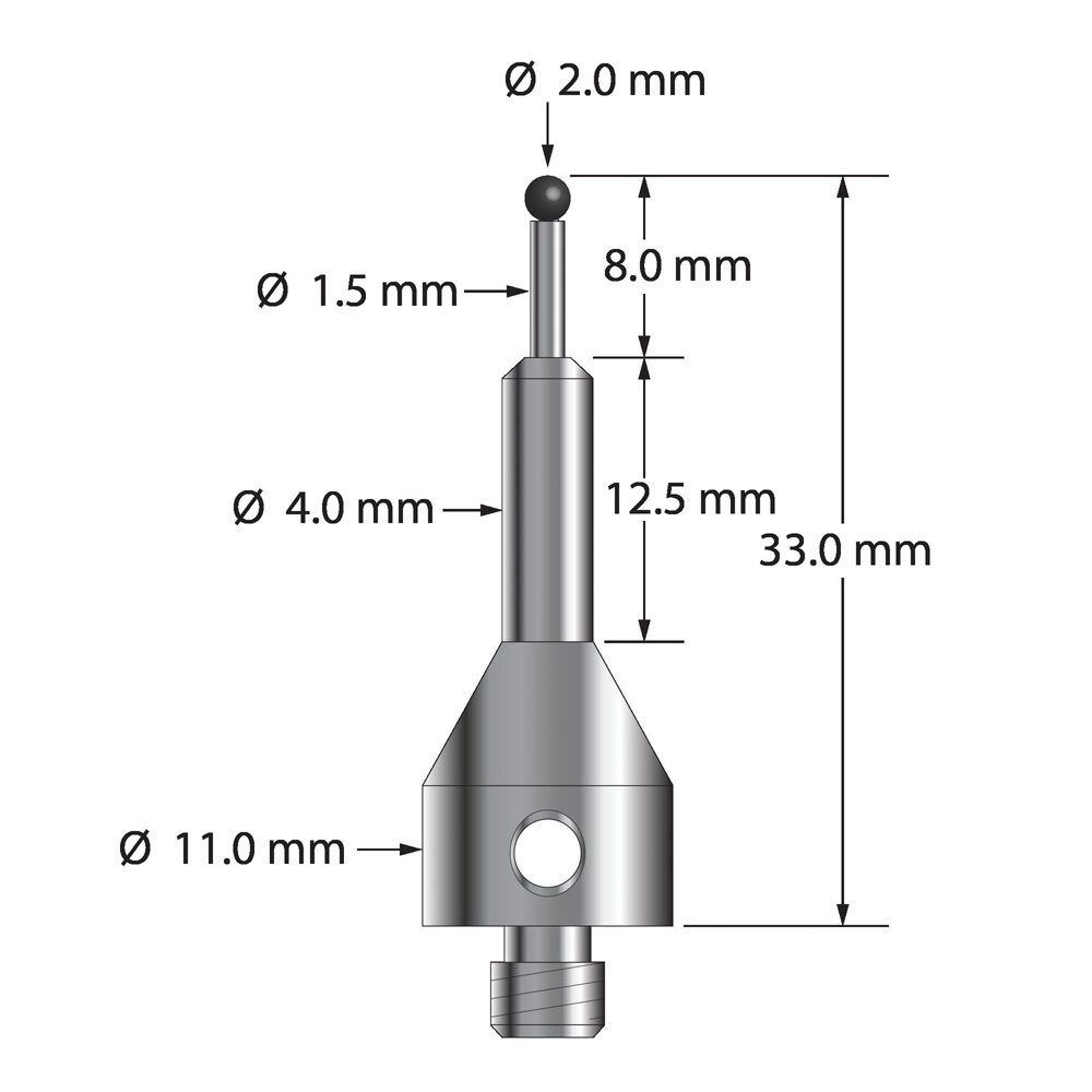 Описание Щуп M5 с шариком из нитрида кремния диаметром 2,0 мм, карбидным стержнем диаметром 1,5 мм и коническим основанием из нержавеющей стали диаметром 11,0 мм и длиной 25,0 мм. Общая длина стилуса составляет 33,0 мм. Вес иглы составляет 7,60 грамма. Технические характеристики