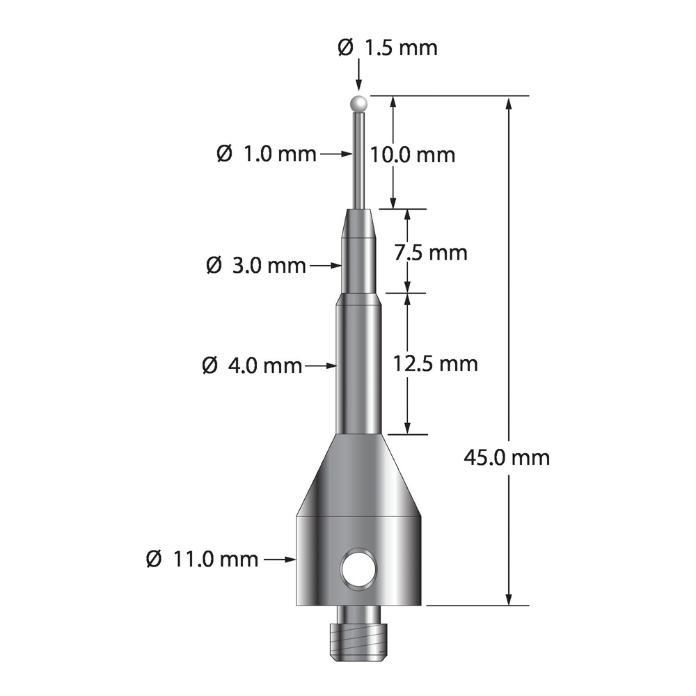 Описание Щуп M5 с циркониевым шариком диаметром 1,5 мм, карбидным стержнем диаметром 1,0 мм и коническим основанием из нержавеющей стали диаметром 11,0 мм и длиной 35,0 мм. Общая длина иглы составляет 45,0 мм. Вес стилуса составляет 10,25 грамма. Технические характеристики