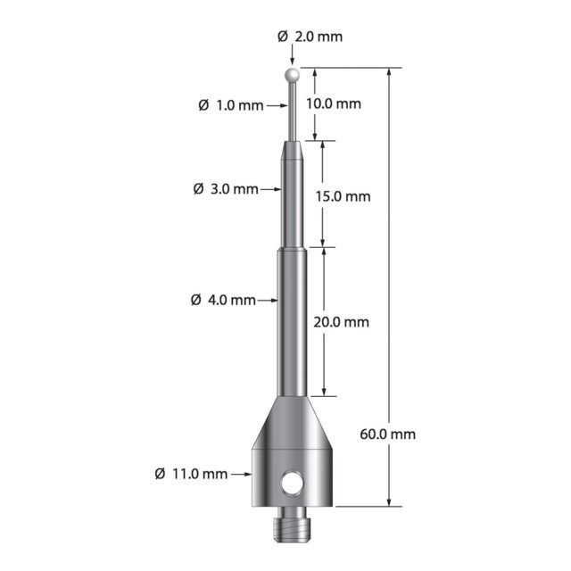 Описание Щуп M5 с циркониевым шариком диаметром 2,0 мм, карбидным стержнем диаметром 1,0 мм и основанием из нержавеющей стали диаметром 11,0 мм и длиной 50,0 мм. Общая длина иглы составляет 60,0 мм. Вес иглы составляет 11,21 грамма. Технические характеристики