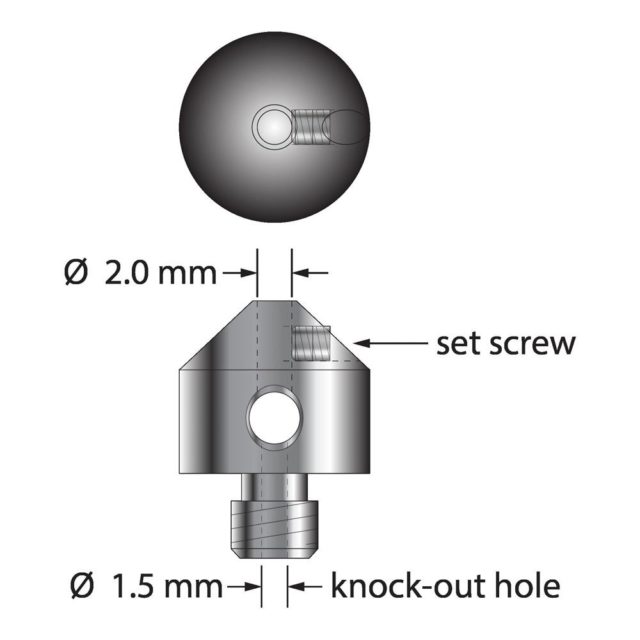 Описание Держатель щупа из нержавеющей стали с резьбой M5. Вмещает один щуп без резьбы со стержнем диаметром 2,0 мм. Имеет выбивное отверстие в основании для легкого удаления сломанных стеблей. Вес 4,47 грамма. Включает один шестигранный ключ на 0,7 мм (на фото) для регулировки установочного винта. Сравните с Zeiss 626115-5000-199. Технические характеристики