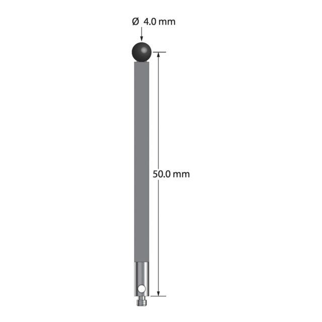 Описание Щуп M2 с шариком из нитрида кремния диаметром 4,0 мм, стержнем из углеродного волокна диаметром 3,0 мм и основанием из нержавеющей стали диаметром 3,0 мм и длиной 7,0 мм. Длина иглы до центра шарика 50,0 мм. Вес иглы составляет 1,17 грамма. Сравните с Renishaw A-5004-1970. Технические характеристики