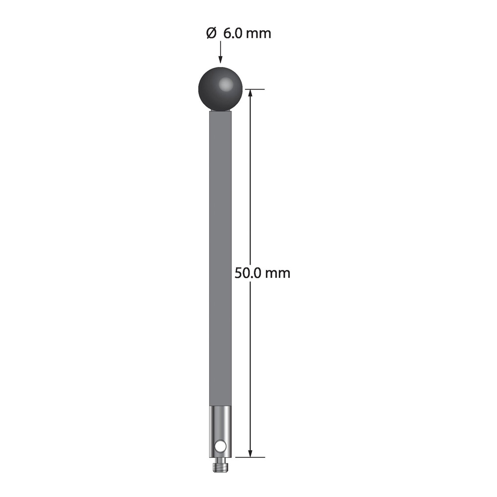 Описание Щуп M2 с шариком из нитрида кремния диаметром 6,0 мм, стержнем из углеродного волокна диаметром 3,0 мм и основанием из нержавеющей стали диаметром 3,0 мм и длиной 7,0 мм. Длина иглы до центра шарика 50,0 мм. Вес иглы составляет 1,08 грамма. Сравните с Renishaw A-5004-1972. Технические характеристики