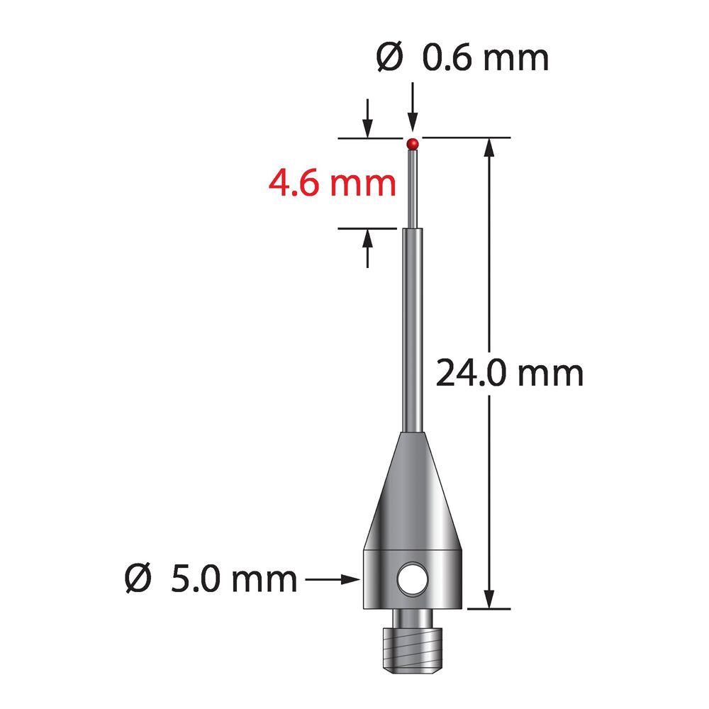 Описание Щуп M3 Therm-X с рубиновым шариком диаметром 0,6 мм, ступенчатым карбидным стержнем и титановым основанием диаметром 5,0 мм и длиной 9,0 мм. Малый диаметр ножки 0,4 мм, большой диаметр 1,0 мм. Общая длина иглы составляет 24,0 мм. Вес иглы составляет 0,61 грамма. Сравните с Zeiss 626113-0061-024. Технические характеристики