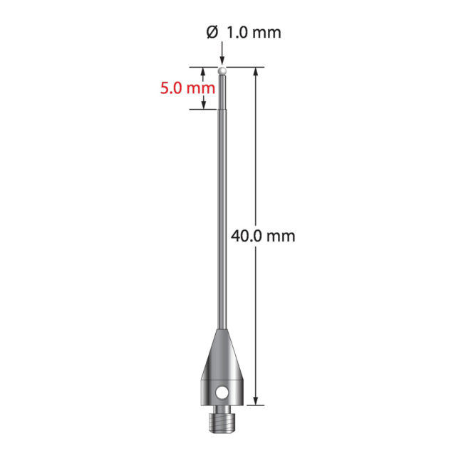 Описание Щуп M3 с шариком из нитрида кремния диаметром 1,0 мм, ступенчатым карбидным стержнем и титановым основанием диаметром 5,0 мм и длиной 9,0 мм. Малый диаметр ножки 0,8 мм, большой диаметр 1,0 мм. Общая длина иглы составляет 40,0 мм. Вес иглы составляет 0,89 грамма. Технические характеристики
