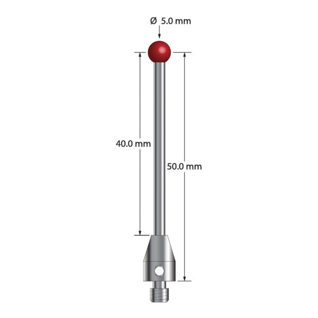 Описание Щуп M4 с рубиновым шариком диаметром 5,0 мм, карбидным стержнем диаметром 2,5 мм и основанием из нержавеющей стали диаметром 7,0 мм и длиной 10,0 мм. Длина иглы до центра шарика 50,0 мм. Вес стилуса составляет 5,12 грамма. Сравните с Renishaw A-5003-4800. Технические характеристики