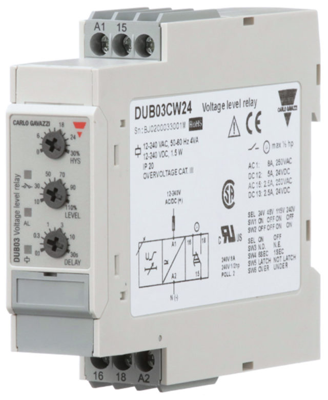 Реле контроля Carlo Gavazzi DUB03 представляет собой однофазное реле повышенного или пониженного напряжения переменного/постоянного тока TRMS. DUB02 имеет выбираемый диапазон измерения, а также регулируемое напряжение. Функция фиксации позволяет поддерживать положение ВКЛ релейного выхода. Функцию блокировки можно использовать, чтобы избежать срабатывания реле при проведении технического обслуживания или замене оборудования.