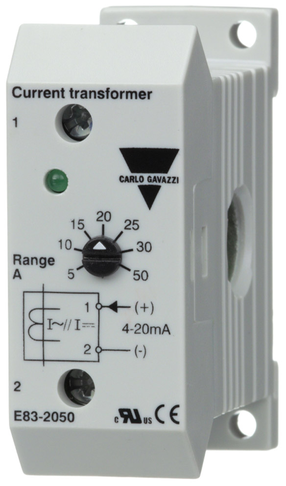 Реле контроля Carlo Gavazzi E83-2050 представляет собой измерительный трансформатор переменного тока с 7 диапазонами, выбираемыми с помощью ручки. Выходной сигнал E83-2050 составляет 4–20 мА постоянного тока в соответствии со стандартом IEC 60381-1. В диапазоне 5 А реле можно применять в качестве преобразователя сигналов 4–20 мА постоянного тока для более крупных стандартных трансформаторов переменного тока со вторичным выходом 5 А переменного тока.