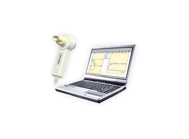RMS Helios 401 Spirometer machine that can diagnose, differentiate, and measure a variety of pulmonary diseases. This PC-based spirometer includes advanced and user-friendly software that provides 34 parameter readings, Pre-Post Bronchodilation Results, Percentage Improvement, and Lung Age Calculations. The software also includes the interpretation of test results, trends, and paediatric incentives.