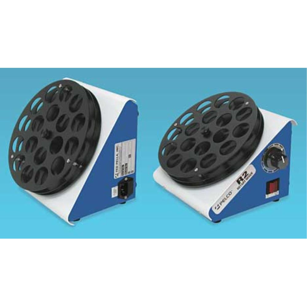 low-speed mixer for EM specimen infiltration preparations (1 — 7.5 RPM), design provides two angles 55 deg. or 35 deg. R2 Rotator with ER007-18 heads shown in the 55 deg. and 35 deg. positions.