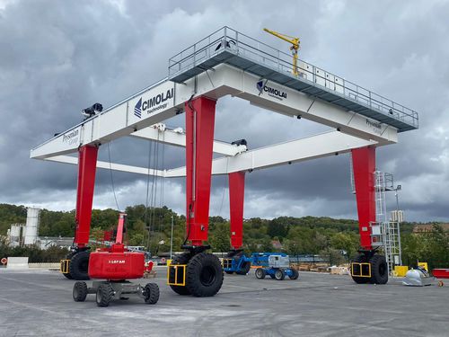 Mobile straddle transporter on tyres to handle and transport precast elements.