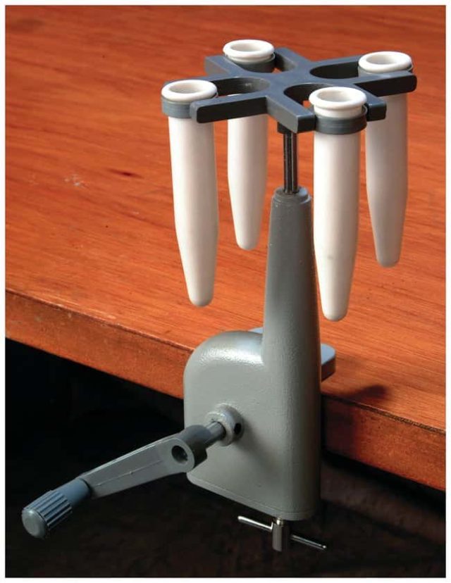 Hand-driven centrifuge comes with a table-mounting clamp.