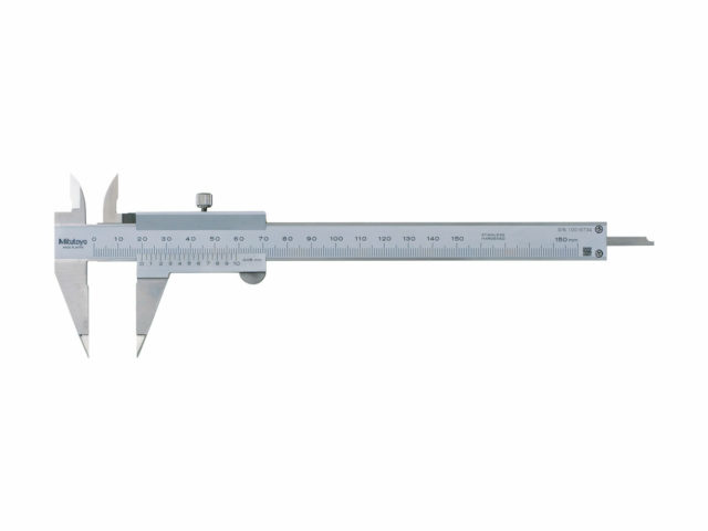 The Mitutoyo Vernier Point Caliper features jaws with narrow tips to attain difficult outside measurements with high accuracy. The narrow-tipped jaws are capable of measuring inside very small grooves and tracks. The point caliper is constructed of hardened stainless steel with a satin chrome finish for protection and easier reading.
