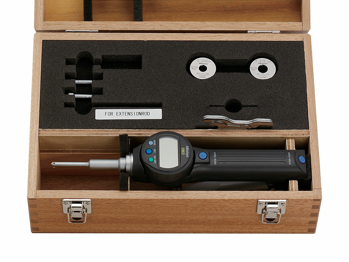 The Mitutoyo Borematic snap-on bore gage interchangeable set includes a display unit and interchangeable measuring heads for each available size in the set. The Borematic bore gage features a large LCD display that rotates 330° for easy reading and an activation handle with a precision-balanced spring that smoothly retracts the anvils when pressed. Titanium Nitride (TiN) coated measuring contact points provide excellent durability and impact resistance and allow the instrument to measure to the bottom of a blind hole. With the ABSOLUTE encoder, once the origin point is set with the ORIGIN button, the Borematic retains the setting for the entire battery life. Repeated origin setting (presetting) is no longer necessary.