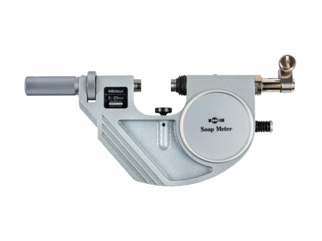 The Mitutoyo snap meter gage utilizes a hardened steel spindle and anvil with carbide faces for precise, highly reliable outside dimension measurements. Many different types of dial or digital indicators attach to the spindle, allowing for GO/NG measurements on a wide variety of applications. The anvil trigger has a balanced spring and operates easily with a button on the anvil side of the frame. The retractable anvil allows for faster workpiece throughput without sacrificing accuracy.