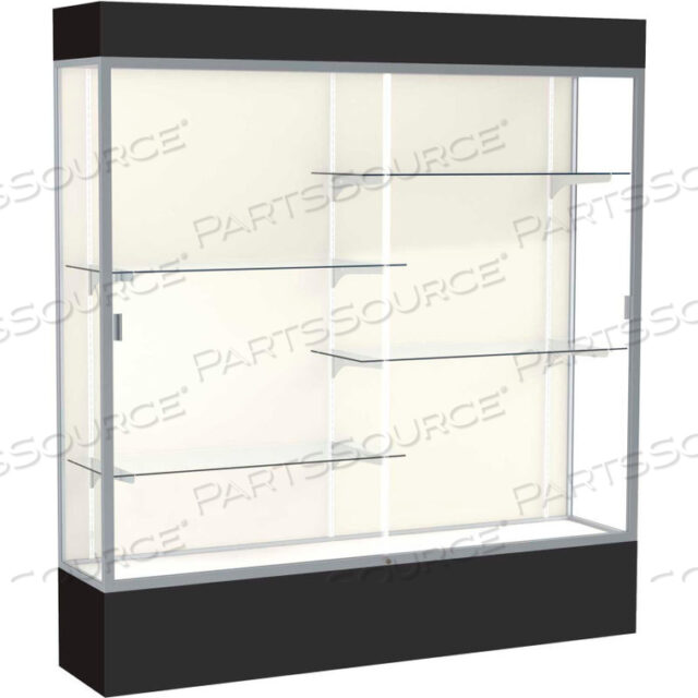 SPIRIT LIGHTED DISPLAY CASE 72W X 80H X 16D PLAQUE BACK SATIN FINISH BLACK BASE & TOP