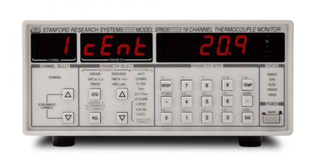 The SR630 is a 16-channel thermocouple monitor designed to read, scan, print and log temperatures or voltages. You can use any one of seven standard thermocouple types to read temperatures from -200 °C to +1700 °C. For remote monitoring applications, the SR630 can time-stamp and store up to 2000 readings in non-volatile memory for later analysis.