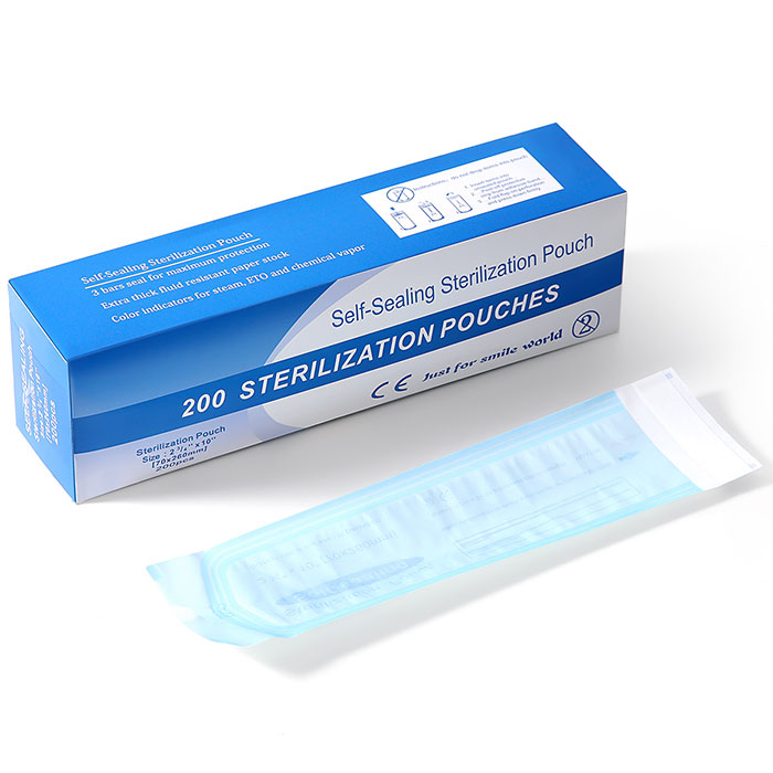 Dental Self-Sealing Sterilization Pouch 200pcs/Box 2.75″x 10″. Ethylene oxide: the color-changing logo changes from red to yellow, High temperature and high pressure: the color-changing logo changes from blue to brown-black.