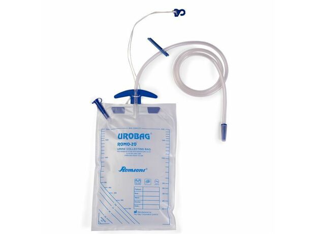 - Мешок для сбора мочи Romsons Romo 10 имеет емкость 2 литра и снабжен супернасадкой длиной 100 см. гладкая трубка, устойчивая к перегибам, для обеспечения неограниченного потока.