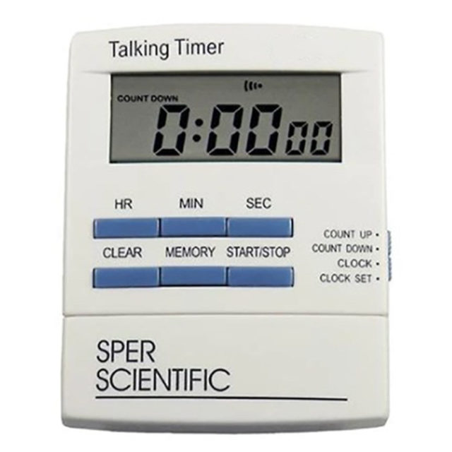 A unique and very useful timer, featuring a clear human voice. Eliminate the need to continually visually check time remaining via voice announcements that can be heard from anywhere in the lab. This allows you to concentrate on the experiment you are timing rather than on the timer. In the countdown mode, Talking Timer will announce the remaining time every hour. In the final hour it will announce the time remaining every 10 minutes, every minute in the final 10 minutes, and every second in the final 10 seconds. The audible countdown gives you time to return to your experiment and be prepared for the final alarm. A choice of six distinctive final alarm sounds makes it easy to identify which Talking Timer has alarmed should you wish to use more than one.