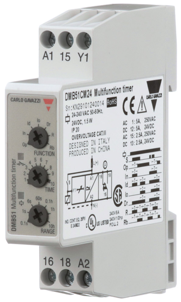 Таймер серии Carlo Gavazzi DMB51/71 включает 7 выбираемых с помощью ручки функций и 7 выбираемых с помощью ручки диапазонов времени в пределах 0,1 с и 100 часов. Предназначен для монтажа на DIN-рейку, подходит как для задней, так и для передней панели.