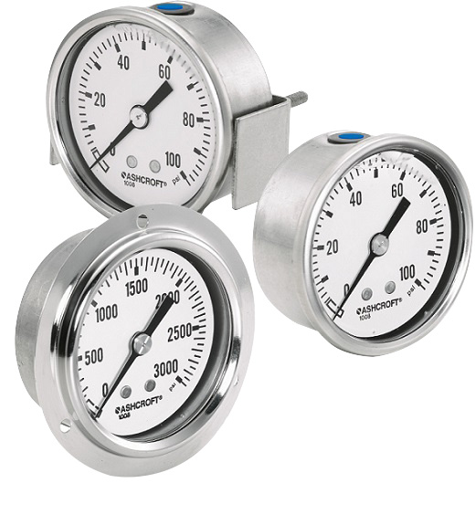 Центральный задний манометр Ashcroft 1008S/SL заправляется жидкостью и трансформируется для монтажа на панели и доступен в размерах циферблата 63 мм и 100 мм.