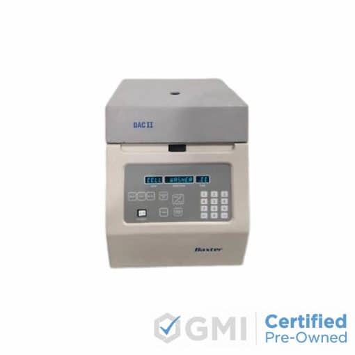 Product Description The Dade DAC II is an automatic centrifuge and cell washer designed for multi-purpose laboratory procedures. The Dade Behring centrifuge is capable of performing cell washing and immunohematology operations including cell re-suspension. Extremely reliable and robust, the DAC II system offers fast wash cycles and programmable test sequences. Also called the Dade DAC II automatic cell washer, the Dade DAC II cell centrifuge provides a saline monitoring feature to warn the operator when saline is not being delivered. Each cycle consists of programmed saline introduction and subsequent decanting during centrifugal rotation. The centrifuge incorporates variable spin times for several different types of centrifuge operation. Decant RPM is operator adjustable to give more than 0.1 mL residuals if desired. With an agitation cycle, the DAC II centrifuge resuspends cells for approximately five seconds and then spins the celIs for 20 seconds before cycle completion. The agitate time, as well as spin after agitate time, is operator-programmable. The front control panel contains a vacuum fluorescent display of RPM functions and time, which allows the operator to continually monitor the status of instrument operation. Other features of the Dade DAC II cell washer centrifuge include centrifuge inner bowl, centrifuge rotor, saline/buffer pump, and control panel. Either l0 x 75mm or 12 x 75mm glass test tubes can be used in the rotor. Use of a 10 mm adapter in each tube carrier is required for 10 x 75 mm test tubes. Call us today to learn more about the Dade DAC II Centrifuge