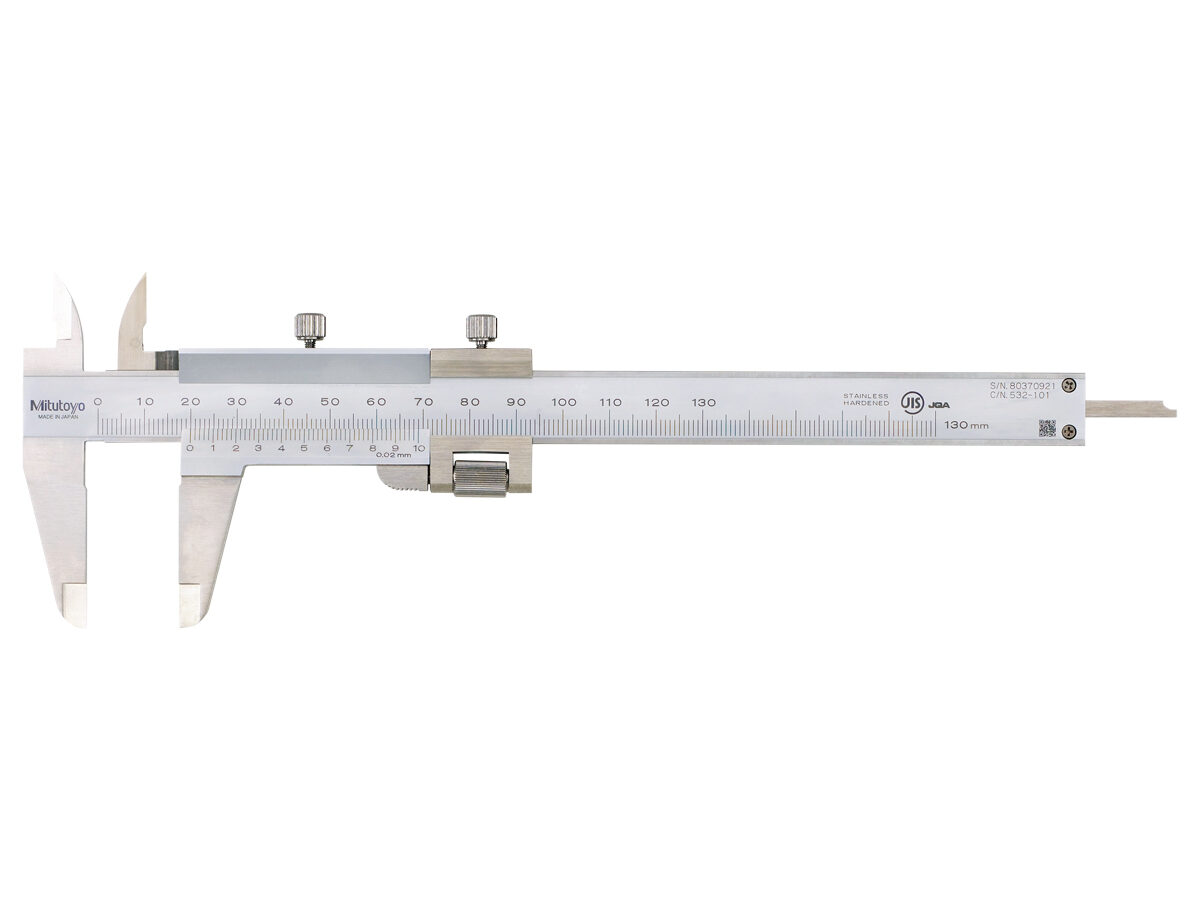 The Mitutoyo Vernier scale caliper with fine adjustment carriage measures outside and inside dimensions, along with depth and step, with high precision and control. The carriage feeds the slider finely for exceptionally precise measurements. The Vernier caliper»s 14-degree face angle offers easier reading and helps prevent parallax error in the measurement. The scales are raised to slide easily and protect the graduation markings. The Vernier caliper with thumb clamp is constructed of stainless steel that is corrosion resistant and has a satin chrome finish which reduces glare.